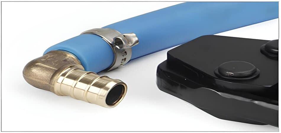 The connection above is established using a single crimp ring. The undivided piece of metal is slightly larger than the PEX tubing, which slides onto its end. The crimp ring tool has specialized jaws that wrap around the ring’s outer diameter. It provides a crimped connection by forcing the tool’s handles closed. It is also utilized to secure this ring to the tube. Moreover, it helps to connect the fitting and the piece of PEX. A gauge is necessary to ensure a correct connection following crimping.