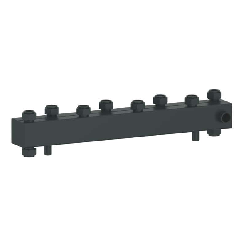 This heating distribution manifold is a specialized core distribution component engineered for hydronic heating systems. It is designed to ensure uniform flow rates across all connected branch circuits, featuring a multi-port symmetrical layout. Allows simultaneous connection to multiple radiator units. consistent hot water distribution. Integrated reserved ports support the addition of auxiliary components, such as valves and flow meters. It serves as a centralized hub for heating system fluid distribution.