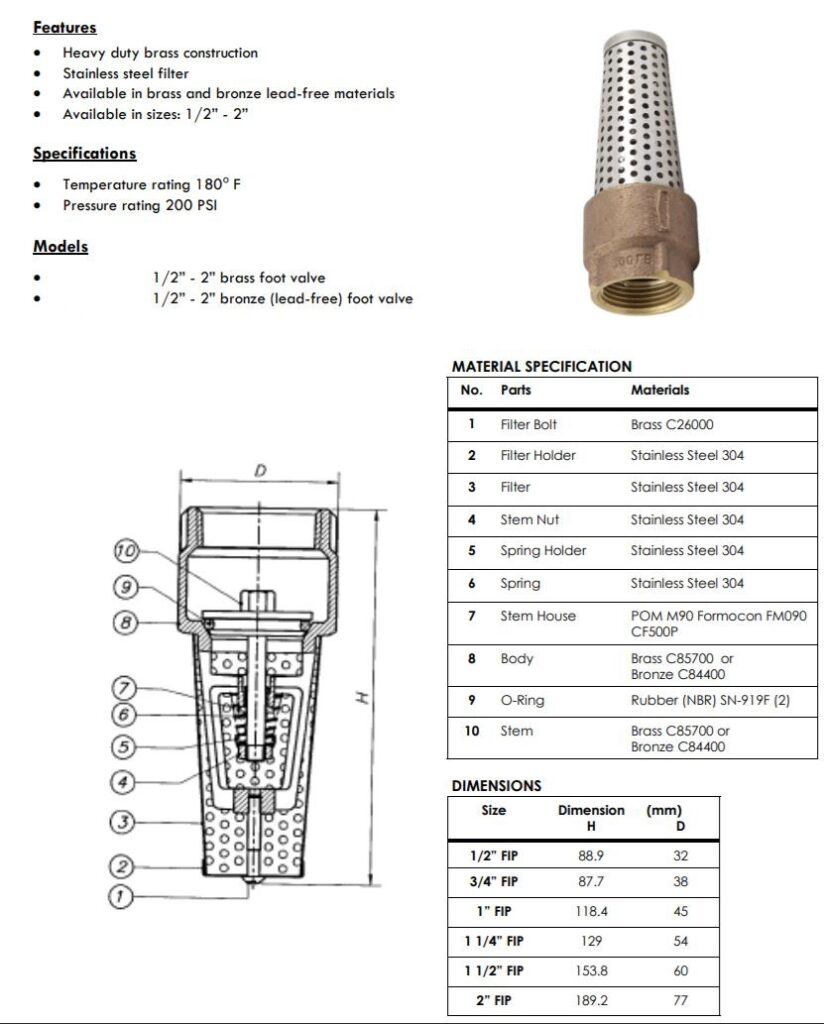 No matter your application, the brass foot valves fit all, from light to heavy-duty. However, consider choosing the “Lead-Free Brass” material if you will use it in your potable water supply.